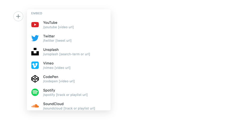 Images from Unsplash can be searched and inserted using a dynamic card in the Ghost editor. Type / or click + on a new line to open the card and select Unsplash: