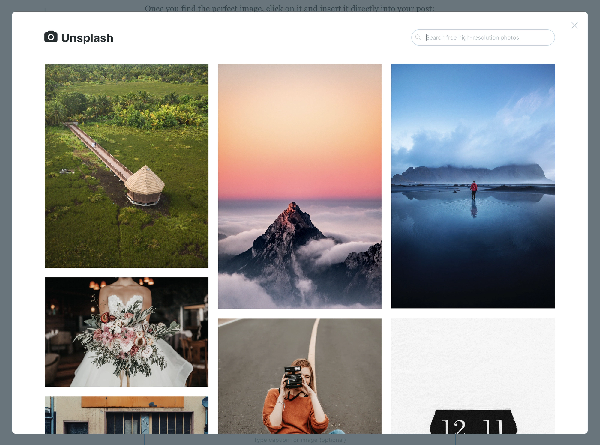 Then select an image from the enormous Unsplash catalog to use in your post. You can search to refine the results further depending on your post and exactly what image you’re looking for.