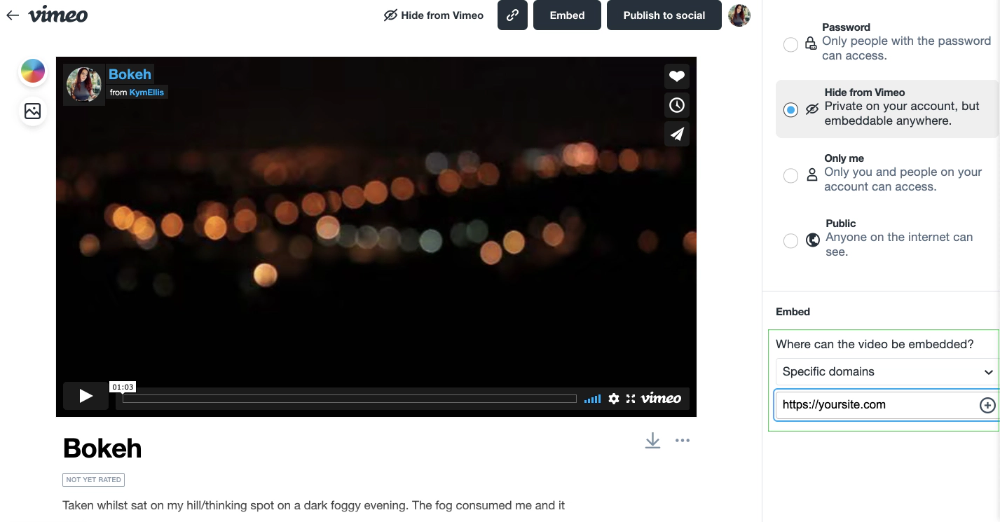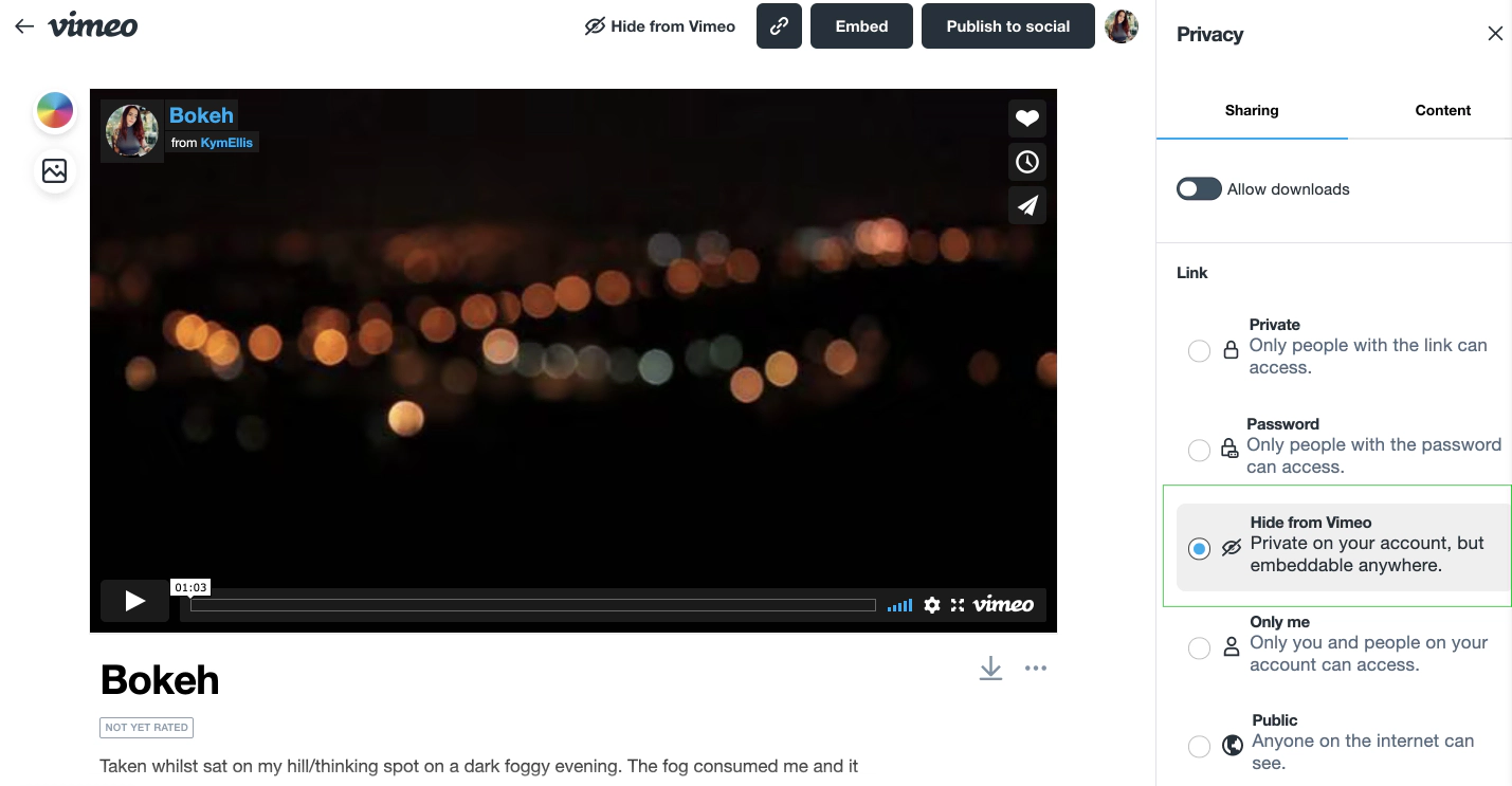 On the video you’d like to embed on a member only post, update the privacy settings by selecting Hide from Vimeo: